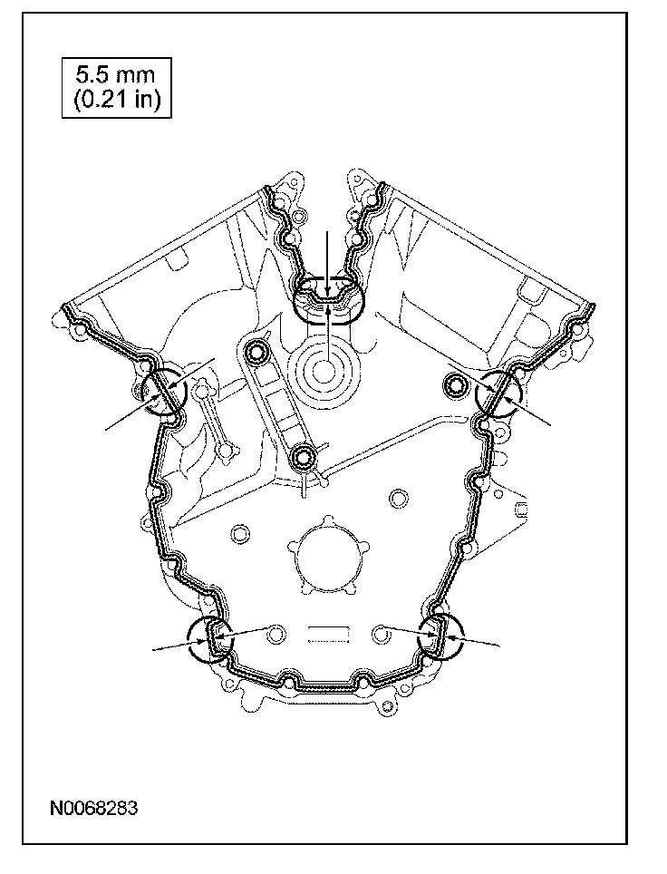 Apply a 5.5 mm (0.21 in) bead of Motorcraft High Performance Engine RTV Silicone to the oil pan-to-cylinder block joint and the cylinder head-to-cylinder block joint areas of the engine front cover in 5 places as indicated.