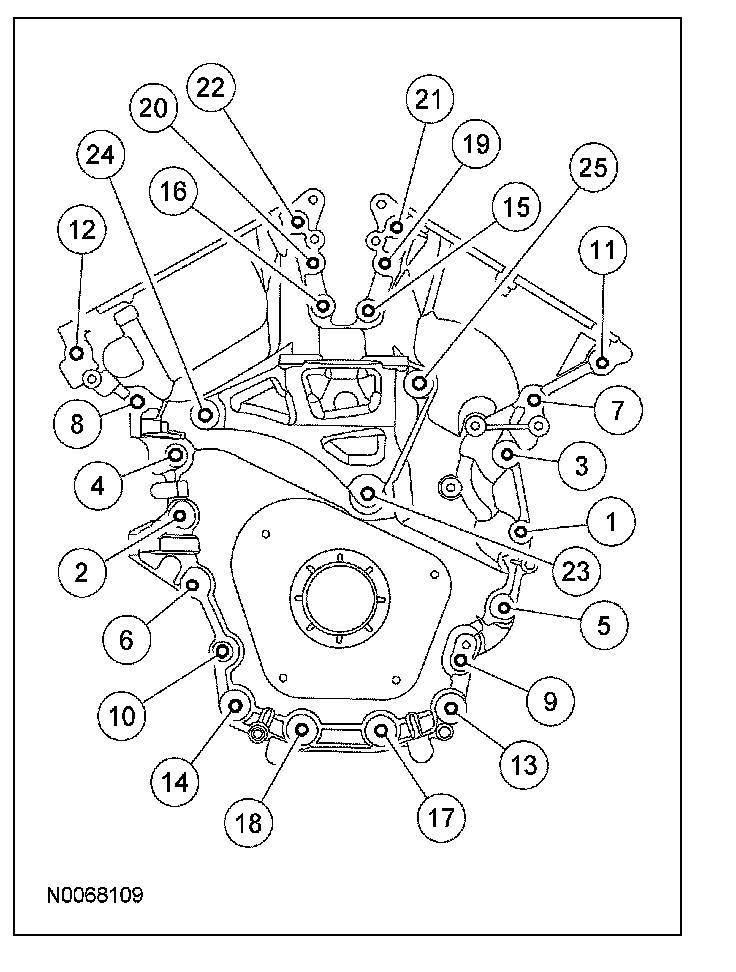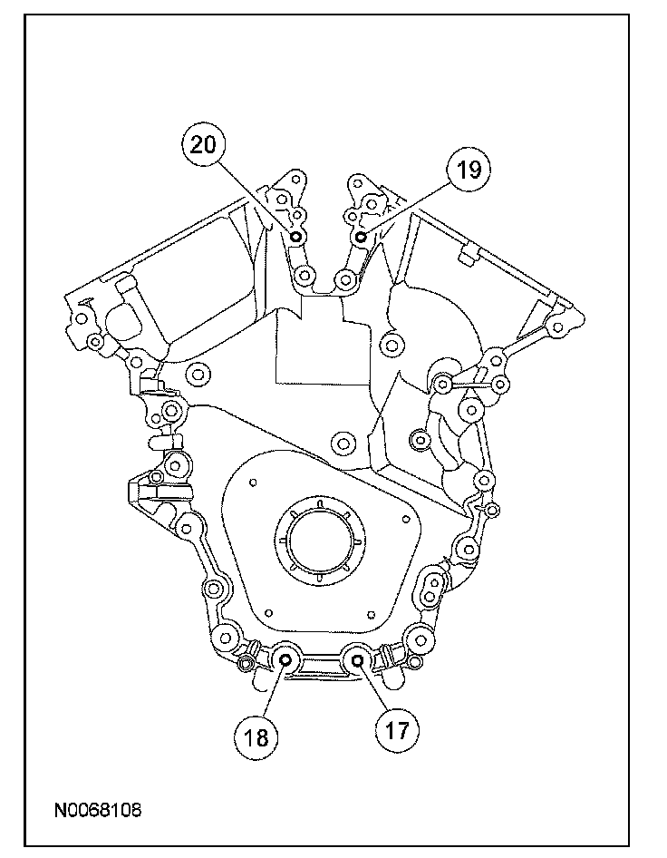 NOTE: The engine front cover and bolts 17, 18, 19 and 20 must be installed within 4 minutes of the initial sealant application. The remainder of the engine front cover bolts and the engine mount bracket bolts must be installed and tightened within 35 minutes of the initial sealant application. If the time limits are exceeded, the sealant must be removed, the sealing area cleaned and sealant reapplied. To clean the sealing area, use silicone gasket remover and metal surface prep. Failure to follow this procedure can cause future oil leakage.