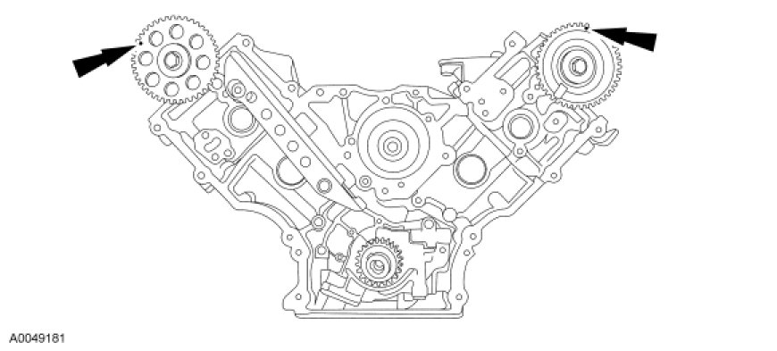 Rotate the RH camshaft sprocket until the timing mark is approximately at the 11 o'clock position. Rotate the LH camshaft sprocket until the timing mark is approximately at the 1 o'clock position.
