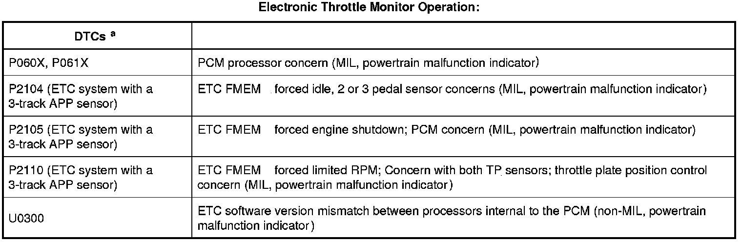 a - Correlation and range/performance - sensor disagreement between processors internal to the PCM, TP inconsistent with requested throttle plate position. Monitor execution is continuous. Monitor false detection duration is less than 1 second to register a concern. Refer to Diagnostic Trouble Code (DTC) Charts and Descriptions for additional DTC information.