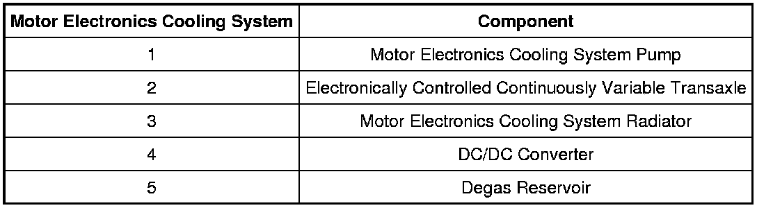 The motor electronics cooling system is required to maintain an acceptable temperature for the transaxle and the DC/DC converter. The system temperature is monitored by the motor electronics coolant temperature (MECT) sensor, which is an input to the PCM. The PCM commands the MECS pump using the MECS pump relay. The MECS pump is commanded on whenever the traction battery contactors are closed. The coolant in the system flows in a loop from the MECS pump, to the transaxle, then into the MECS radiator bottom hose port, out of the top hose port of the MECS radiator, into the DC/DC converter, and back into the MECS pump. The cooling system has a degassing system that is connected in parallel between the MECS radiator and the MECS pump. The degassing system bleeds air/gases into the degas reservoir.