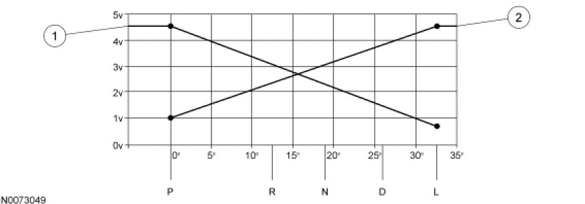 The TR-A1 signal has a negative voltage slope, meaning the voltage decreases when the sensor angle increases. The typical TR voltage ranges from approximately 4.3 volts in the PARK position to approximately 0.6 volt in the LOW gear position. The TR-A2 signal has a positive voltage slope. Voltages increase as the sensor angle increases. The typical voltage for the TR-A2 is about 1 volt in the PARK position to about 4.4 volts in the LOW gear position.