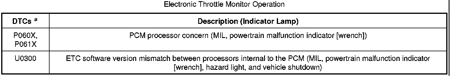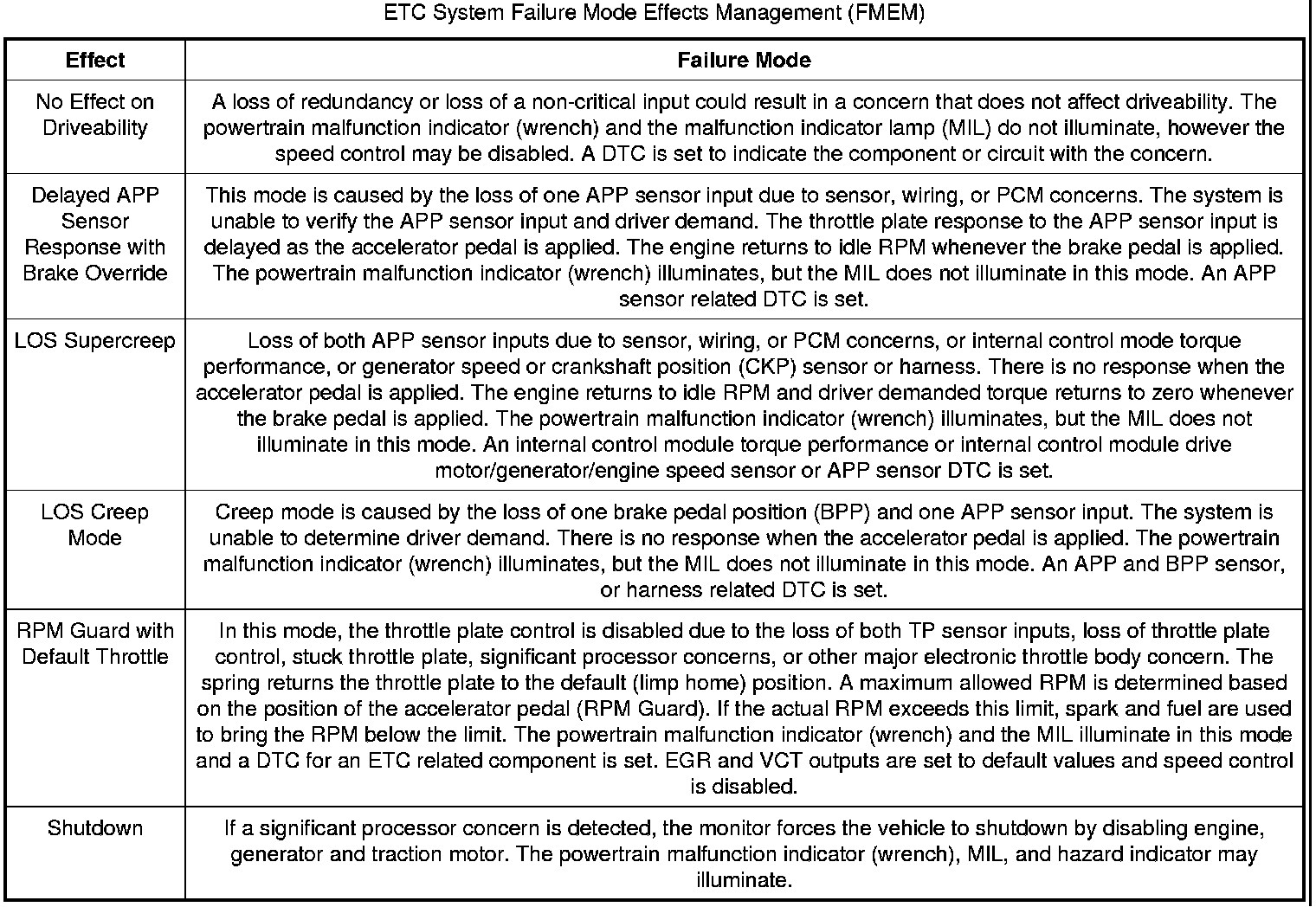 a Note: For all DTCs, in addition to the MIL, the powertrain malfunction indicator (wrench) is on for the concern that caused the FMEM action. Monitor execution is continuous. Monitor false detection duration is less than 5 seconds to register a concern.