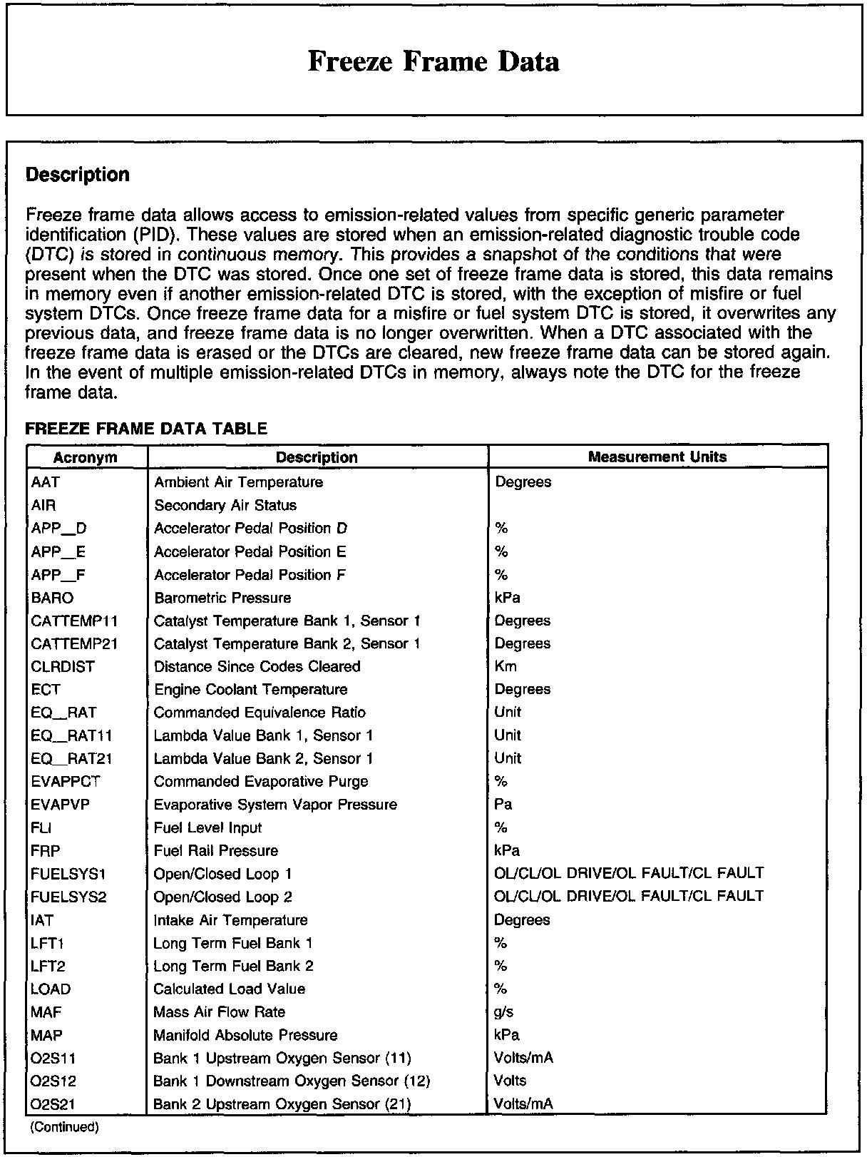 Freeze Frame Data Table And Misfire Freeze-Frame PIDs: