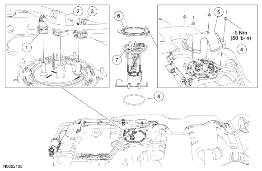 6. NOTICE: Carefully remove the Fuel Pump (FP) assembly to avoid damaging the fuel level sensor.