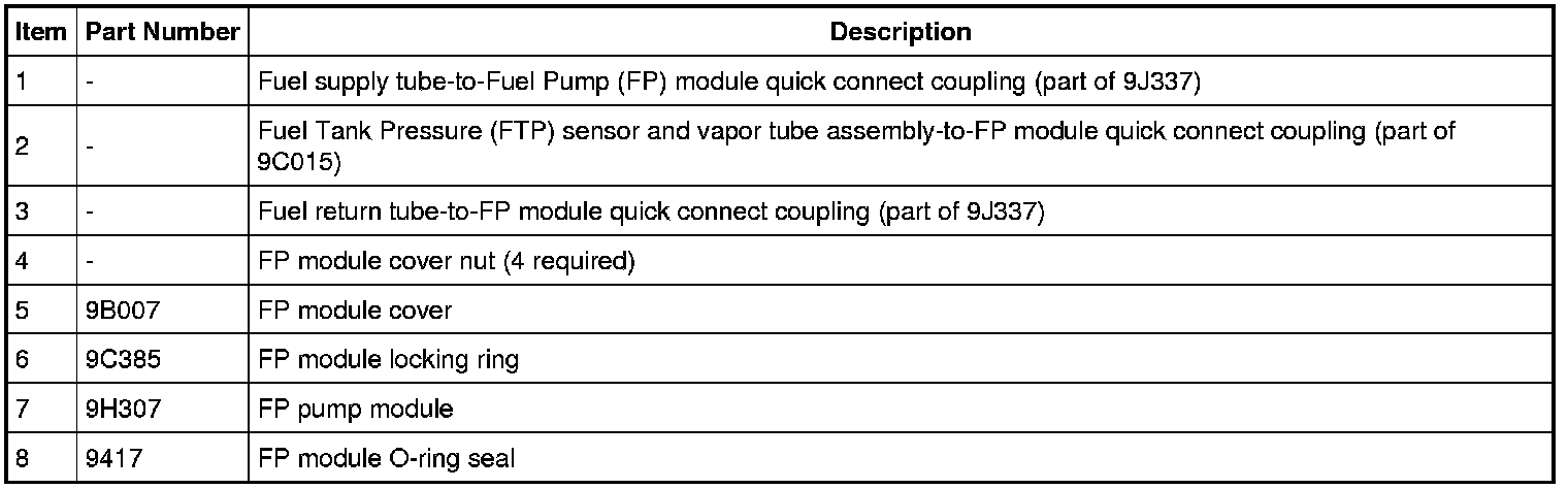 7. NOTICE: Carefully remove the Fuel Pump (FP) assembly to avoid damaging the fuel level sensor.