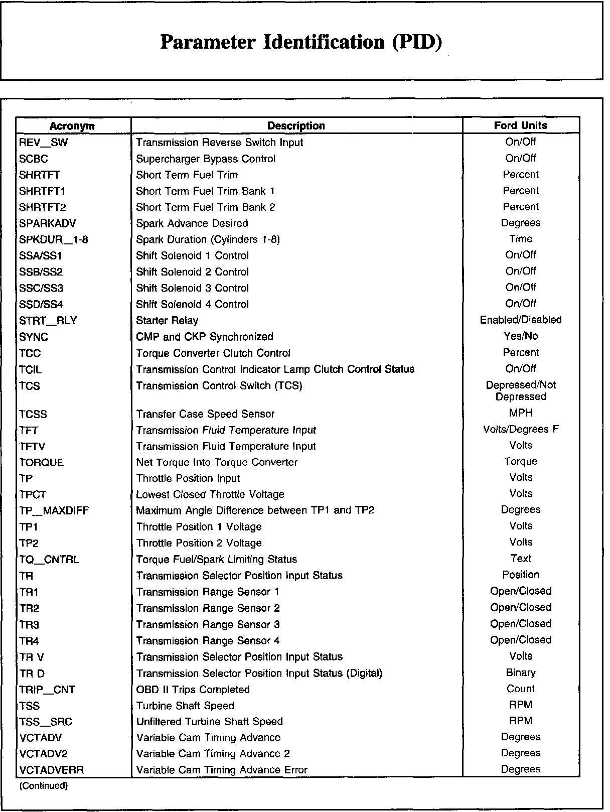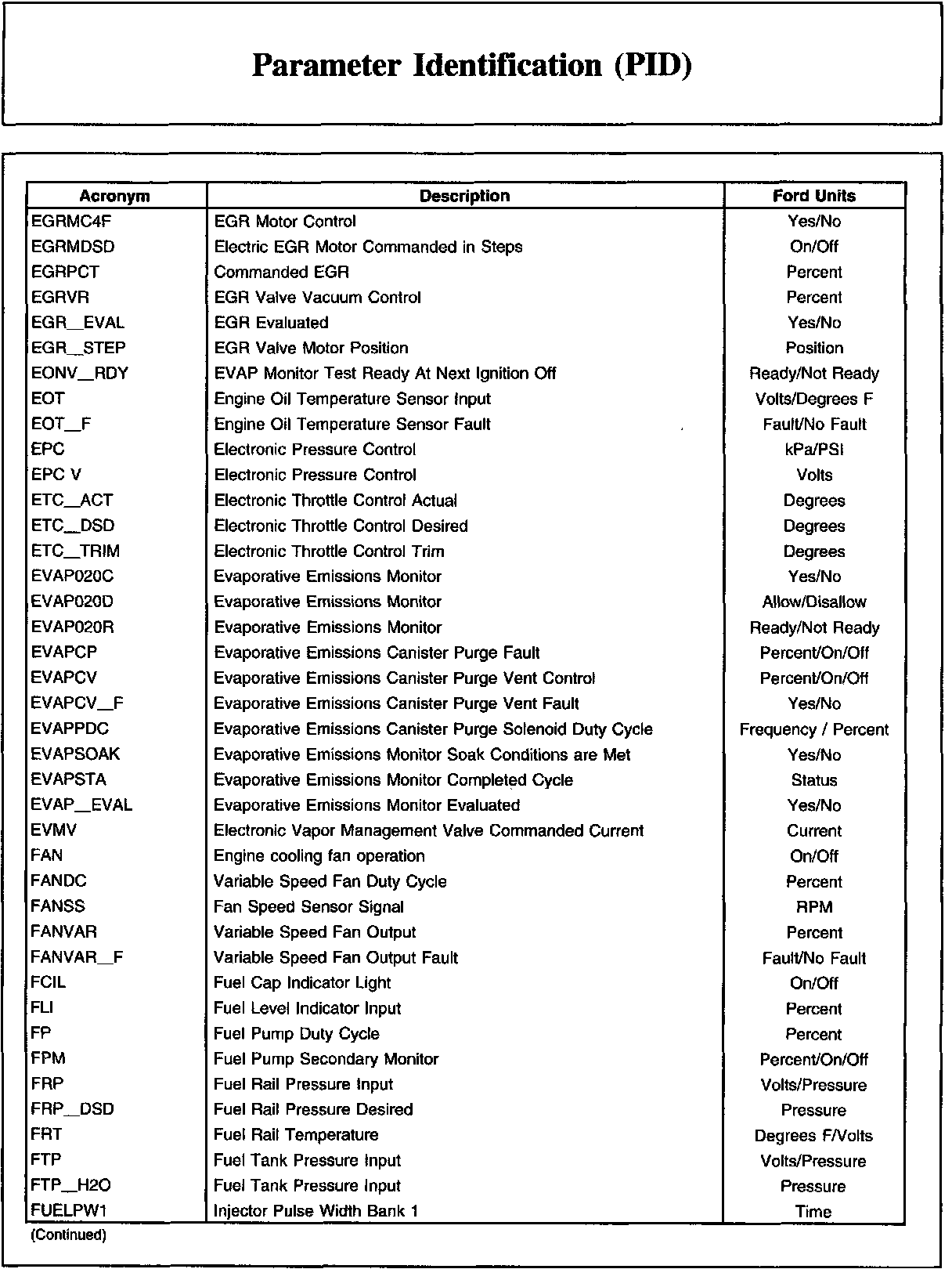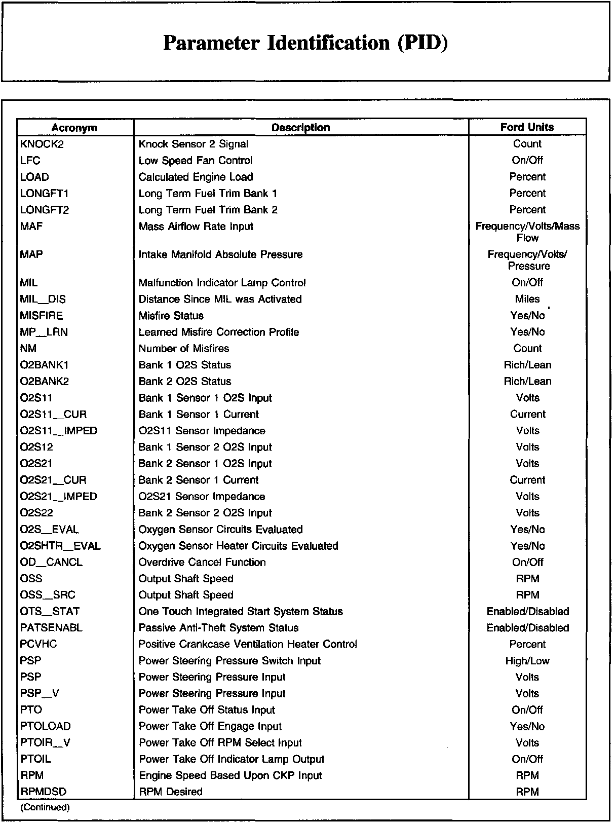 Home >> Ford >> 2009 >> Explorer 2WD V6-4.0L >> Repair and Diagnosis >> Powertrain Management >> Computers and Control Systems >> Testing and Inspection >> Scan Tool Testing and Procedures >> Parameter Identification (PID)