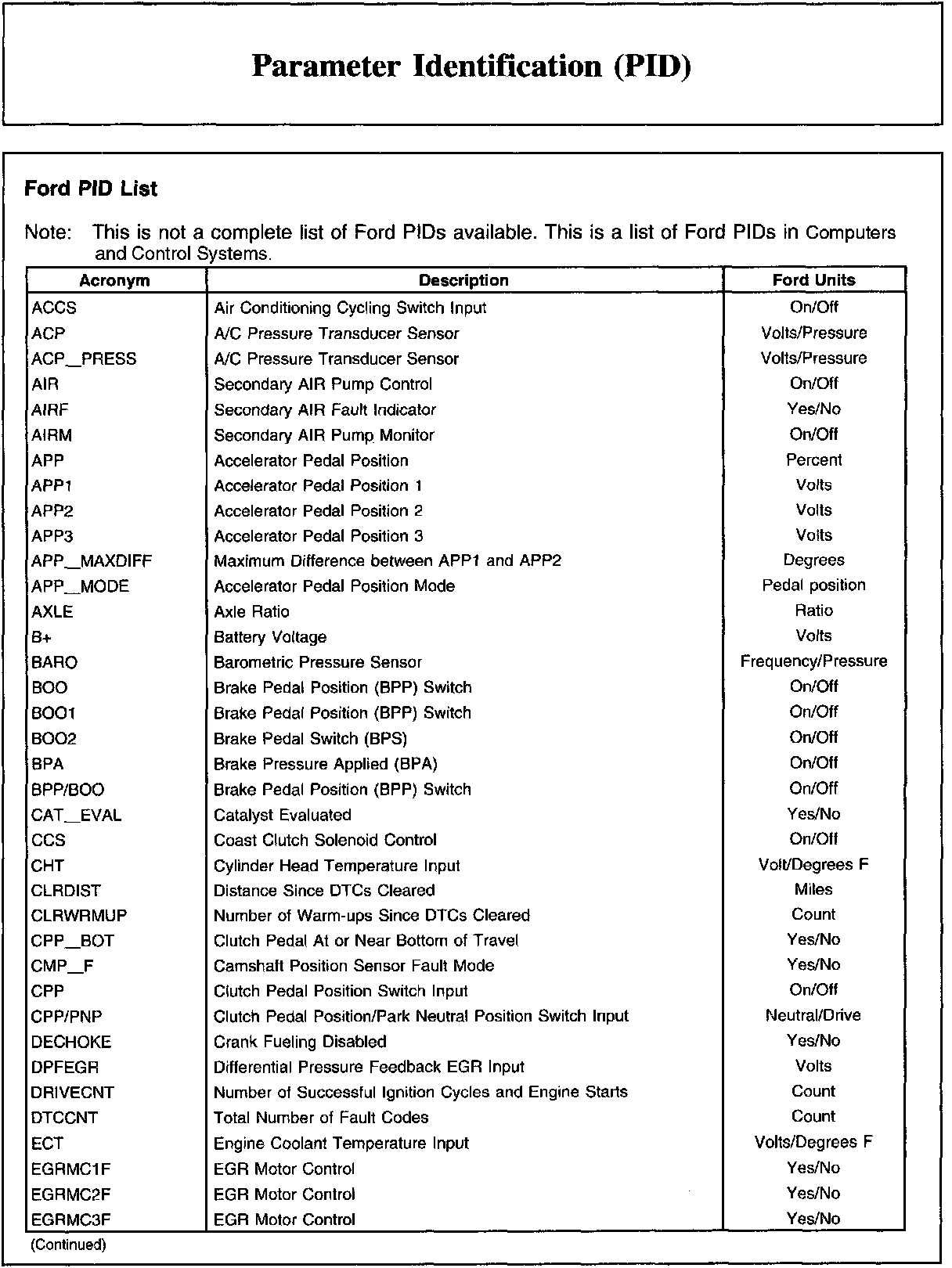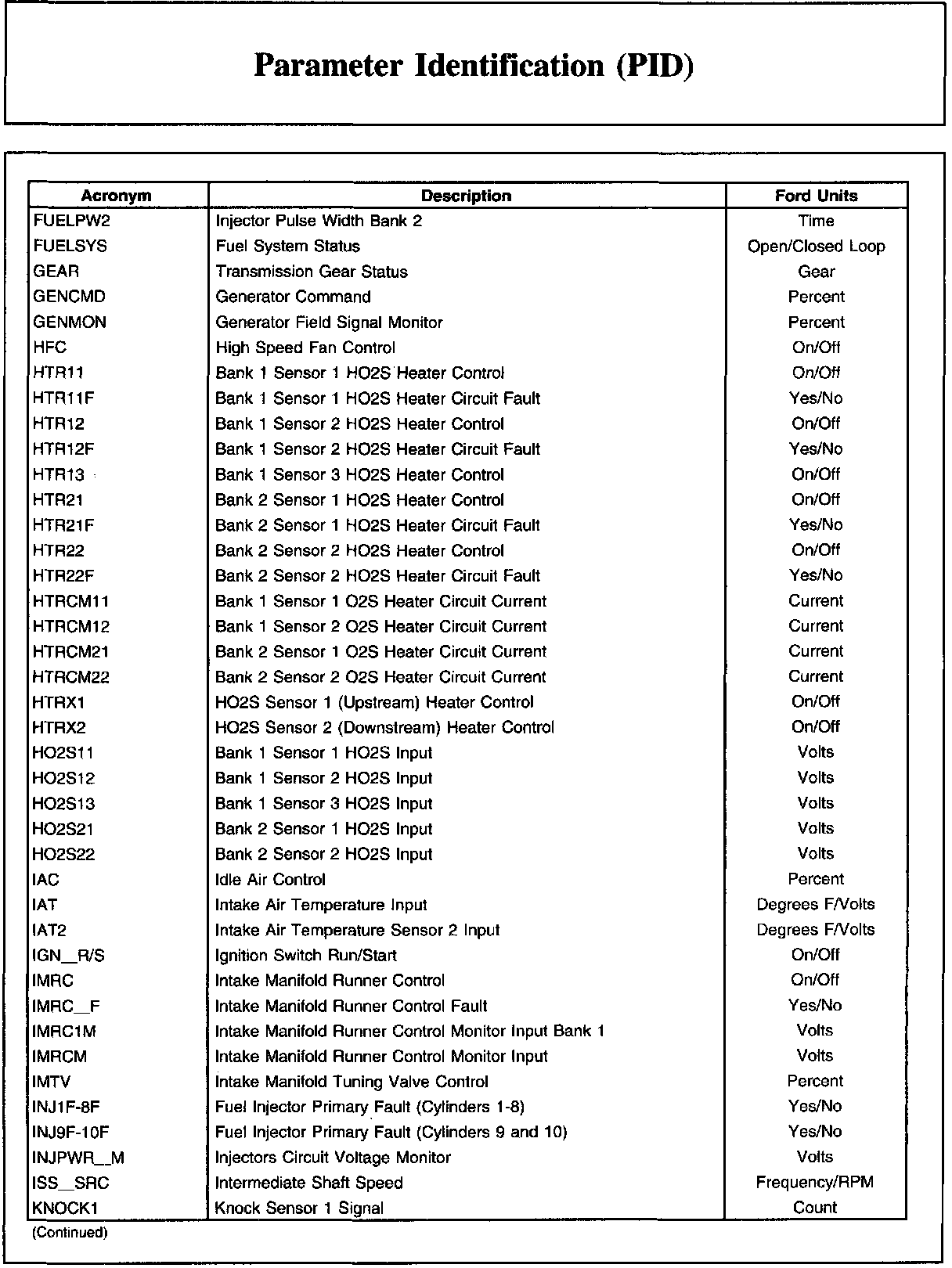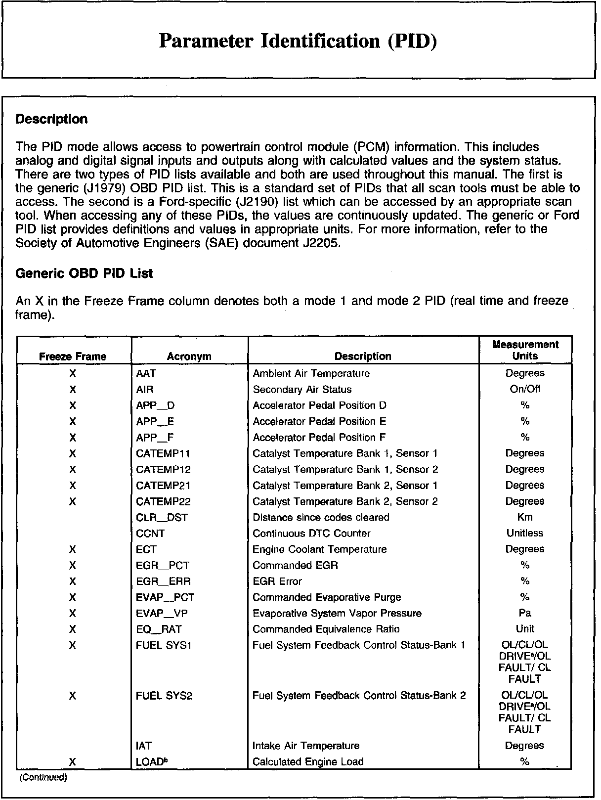 Home >> Ford >> 2009 >> Explorer 2WD V6-4.0L >> Repair and Diagnosis >> Powertrain Management >> Computers and Control Systems >> Testing and Inspection >> Scan Tool Testing and Procedures >> Parameter Identification (PID)
