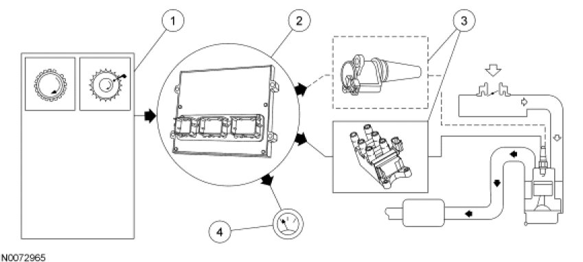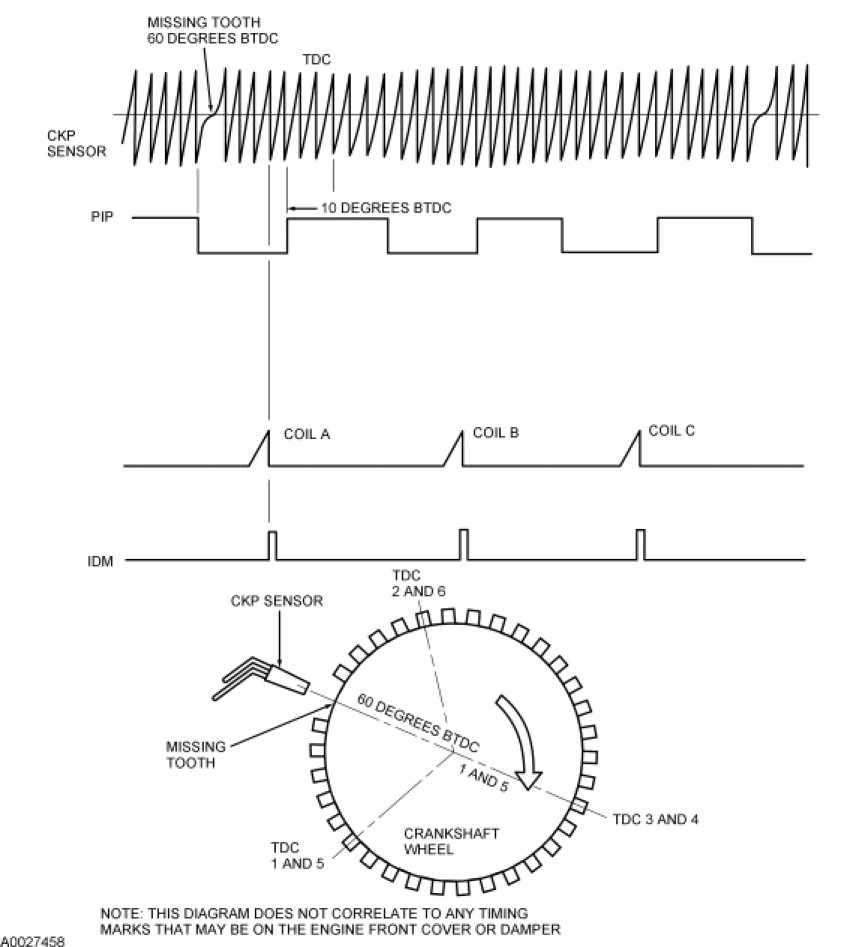 1. The CKP sensor is used to indicate the crankshaft position and speed by sensing a missing tooth on a pulse wheel mounted to the crankshaft. The CMP sensor is used by the COP integrated electronic ignition system to identify the compression stroke of cylinder 1 and to synchronize the firing of the individual coils.