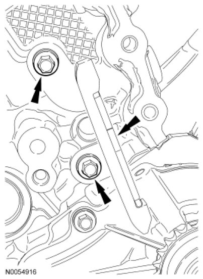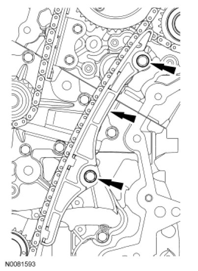 Install the RH primary timing chain guide and the 2 bolts.Tighten to 10 Nm (89 lb-in).