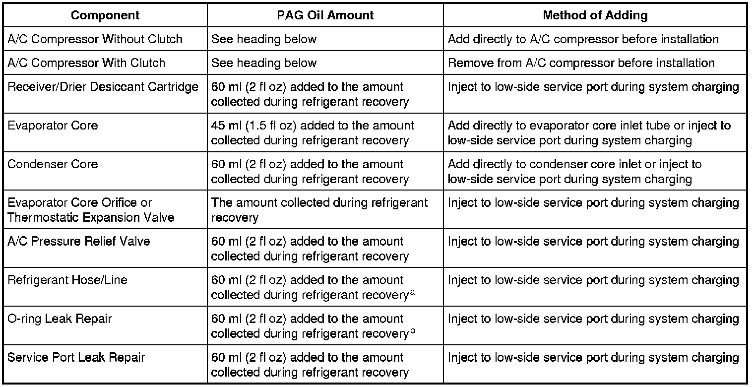 a If an excessive amount of refrigerant oil is lost due to a hose rupture/separation or other damage, the total system refrigerant oil capacity must be added.