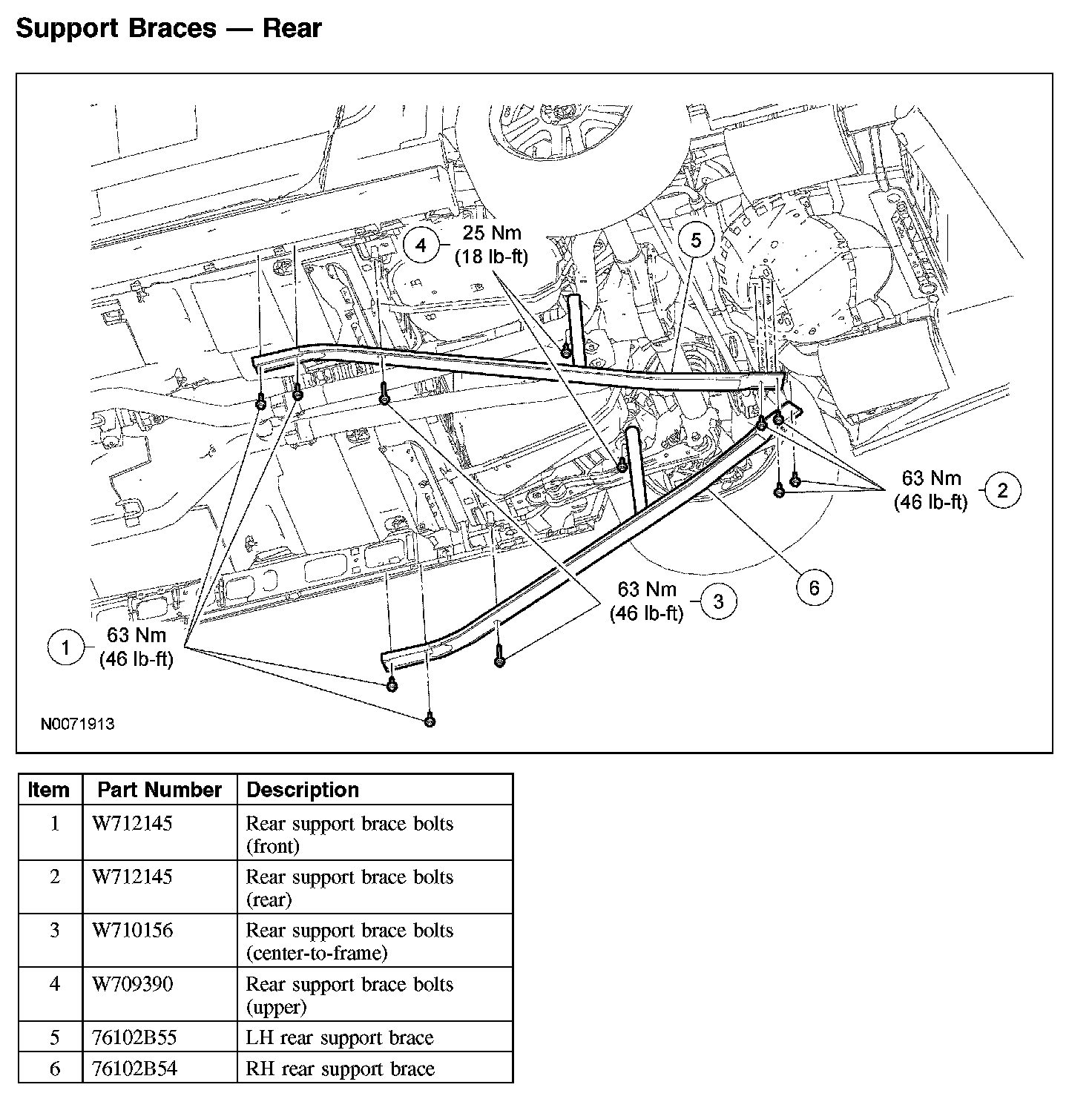 - Tighten the 2 rear support brace bolts (center-to-frame) to 63 Nm (46 lb-ft).