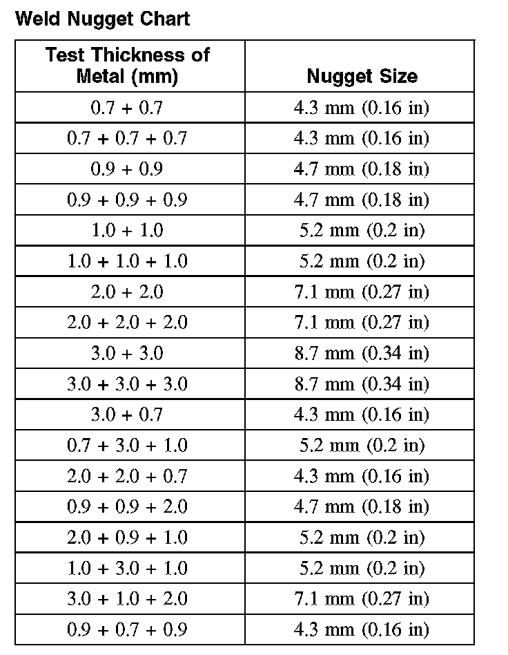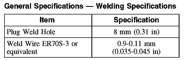 - Factory spot welds may be substituted with either resistance spot welds or MIG plug welds. Spot/plug welds should equal factory welds in both location and quantity. Do not place a new spot weld directly over an original weld location. Plug weld hole should equal 8 mm (0.31 in) diameter.
