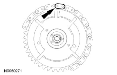 Position the LH timing chain on the camshaft sprocket. Make sure the camshaft sprocket timing mark is aligned with the colored (marked) chain link.