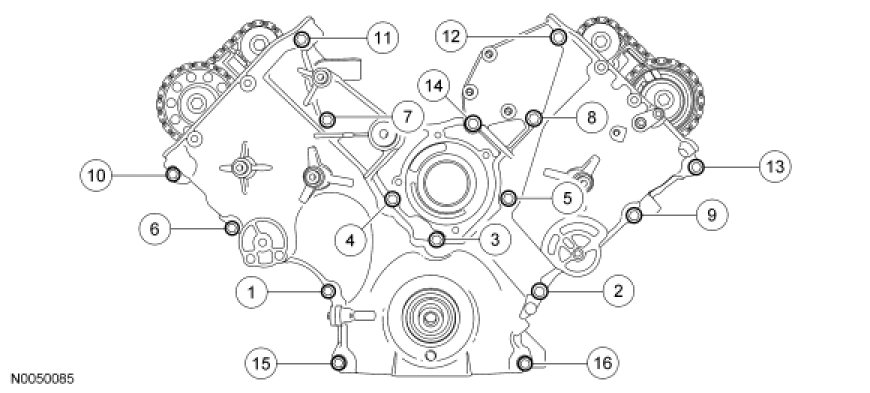 Using new gaskets, install the engine front cover and the 16 bolts. Tighten the bolts in the sequence shown: