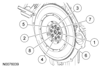Tighten the flywheel bolts evenly in the sequence shown to fully seat the flywheel on the