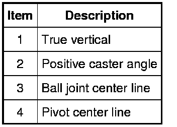 Caster is the deviation from vertical of an imaginary line drawn through the ball joints when viewed from the side. The caster specifications will give the vehicle the best directional stability characteristics when loaded and driven. The caster setting is not related to tire wear.