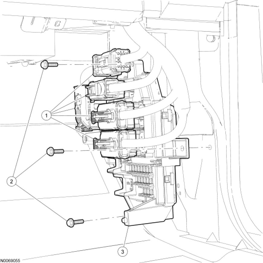 NOTE: The steps included in the SJB removal and installation procedure are critical to restoring the tire pressure monitoring system to normal operation. A new SJB is delivered in a manufacturing mode with 7 pre-set TPMS DTCs. To clear the DTCs, successful configuration of the SJB must occur, followed by successful TPMS sensor training, and a successful self-test, including clearing of the DTCs. The DTCs are as follows: