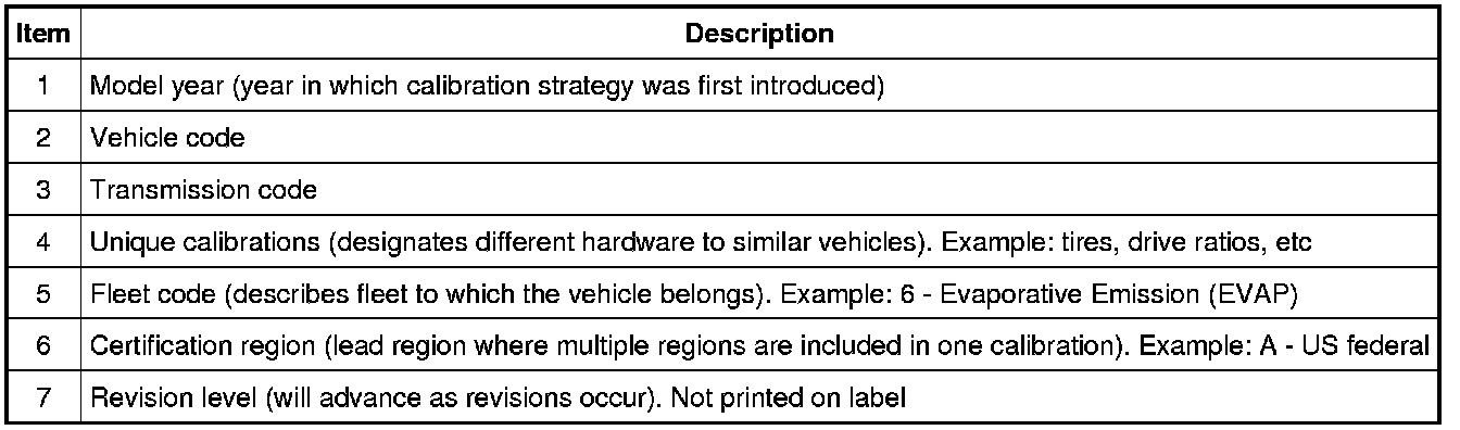 NOTE: Powertrain calibration information is limited to a maximum of 5 characters per line on the Vehicle Certification (VC) Label. Because of this, calibration identification consisting of more than 5 characters will wrap to the second line on the VC label.