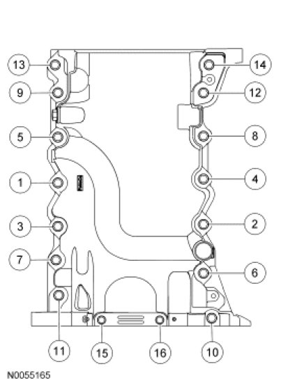 Install the oil pan and bolts 10, 11, 13 and 14.Tighten in the sequence shown to 3 Nm (27 lb-in).