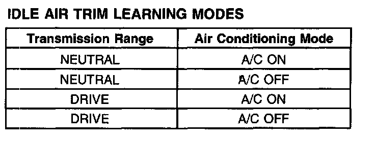 Once the KAM has been reset, the engine must idle for 15 minutes (actual time varies between strategies) to learn new idle air trim values. Idle quality improves as the strategy adapts. Adaptation occurs in 4 separate modes as shown in the following table.