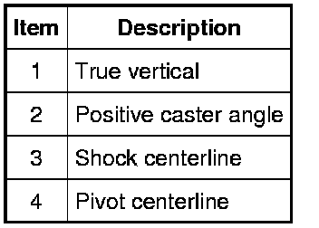 Caster is the deviation from vertical of an imaginary line drawn through the ball joints when viewed from the side. The caster specifications will give the vehicle the best directional stability characteristics when loaded and driven. The caster setting is not related to tire wear.