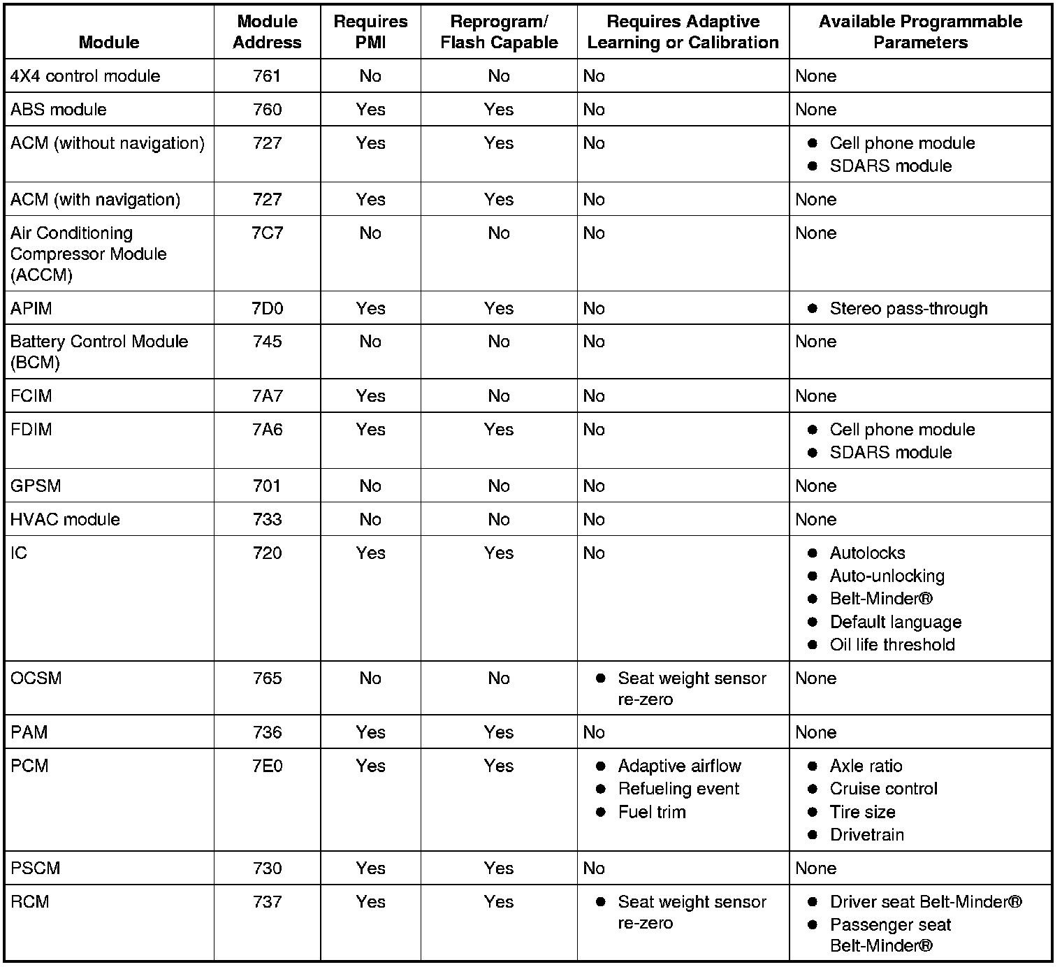 PMI is a scan tool process which configures settings in a new module. Data used for the PMI process is automatically downloaded from the original module and stored when a scan tool session is started. If this data cannot be retrieved from the module being replaced, the scan tool may prompt for As-Built data entry or display a list of parameter values that need to be manually selected. Some modules are reprogrammed during PMI when a strategy/calibration update is available. To carry out PMI, refer to Programmable Module Installation (PMI) Programmable Module Installation (PMI).