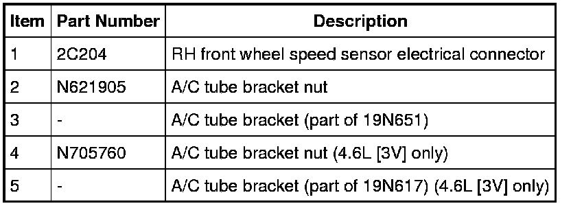 3. Disconnect the RH front wheel speed sensor electrical connector. Remove the nut(s) and position the A/C tube bracket(s) and wiring harness aside.