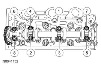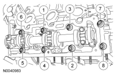 Install the LH cylinder head and tighten the 8 new 12-mm bolts in the sequence shown in 2 stages.