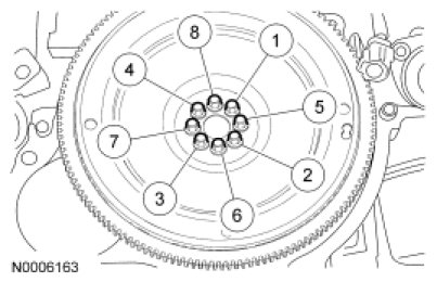 Install the flexplate. Tighten the 8 new bolts in 3 stages in the sequence shown.
