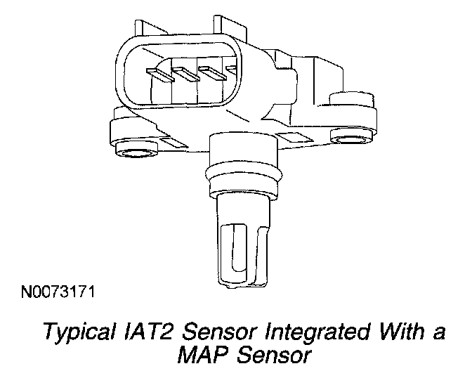 The IAT2 sensor for speed density control systems is centrally located on the intake manifold. The IAT2 sensor measures the intake manifold temperature. The powertrain control module (PCM) uses the information from the IAT2 sensor to determine the speed density air charge and provide input used for various spark control functions. The IAT2 sensor for a speed density system is integral with the manifold absolute pressure (MAP) sensor.