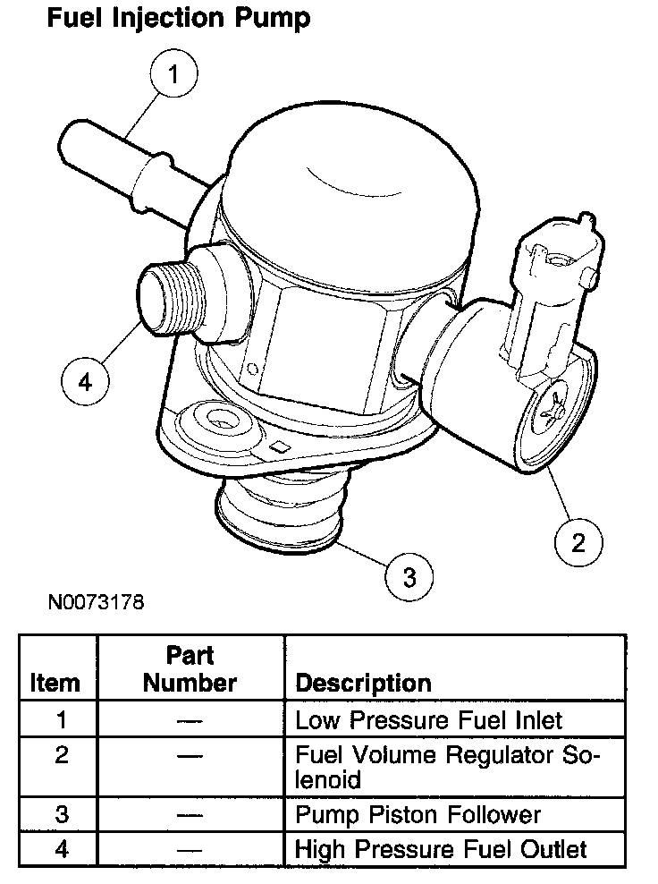 The engine driven fuel injection pump increases fuel rail pressure to the desired level to support fuel injection requirements. Unlike conventional port fuel injection systems, with direct injection the desired fuel rail pressure ranges widely over operating conditions. The pump receives fuel from the fuel pump (FP) module, increases the fuel pressure from approximately 448 kPa (65 psi) to a variable pressure up to 15 MPa (2175 psi), and delivers it to the fuel rails. The fuel injection pump is driven by a dedicated intake camshaft lobe and is located on top of the engine.