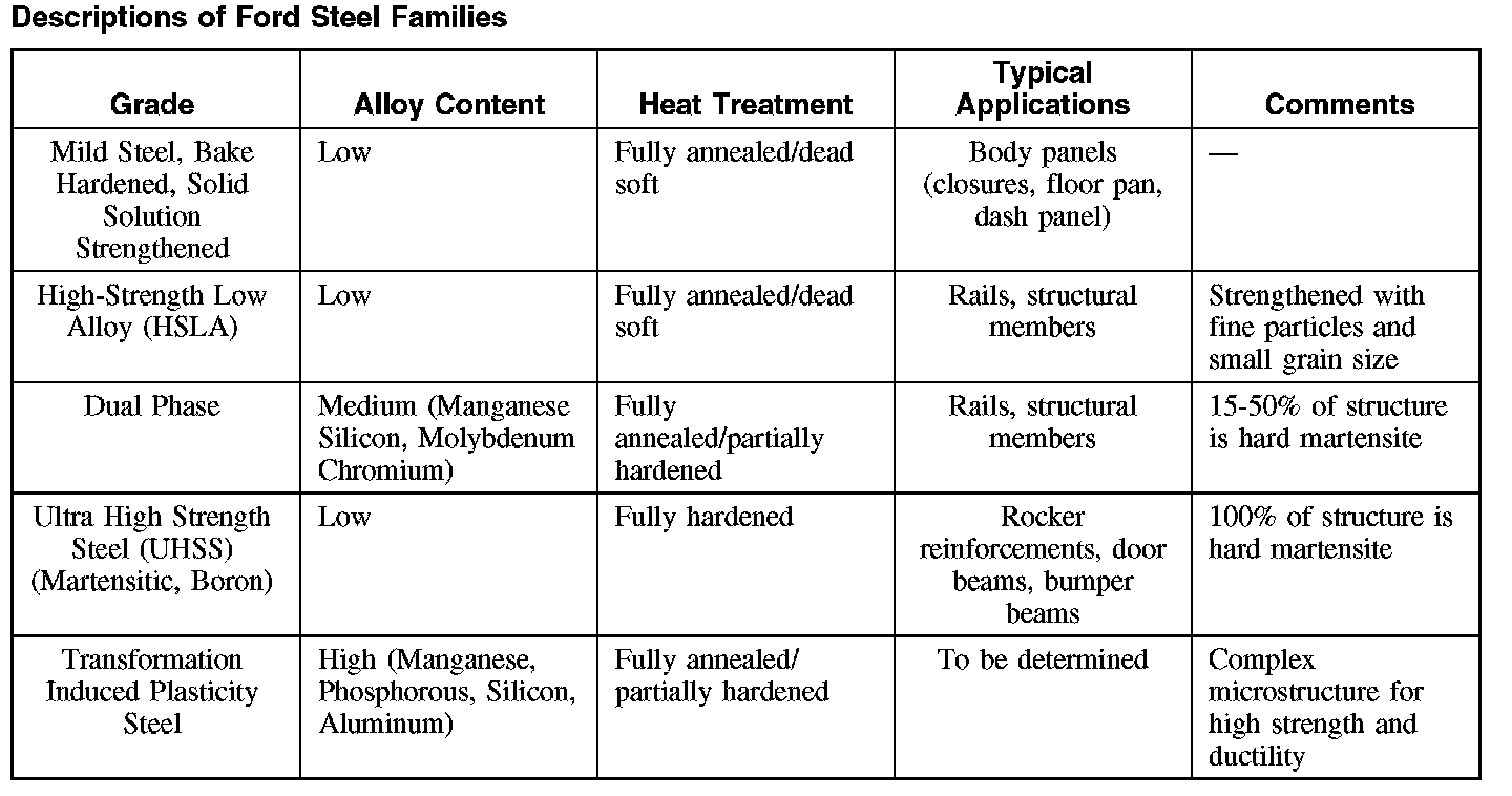 Ford Recommended Steel Repairability Matrix (Part 1):