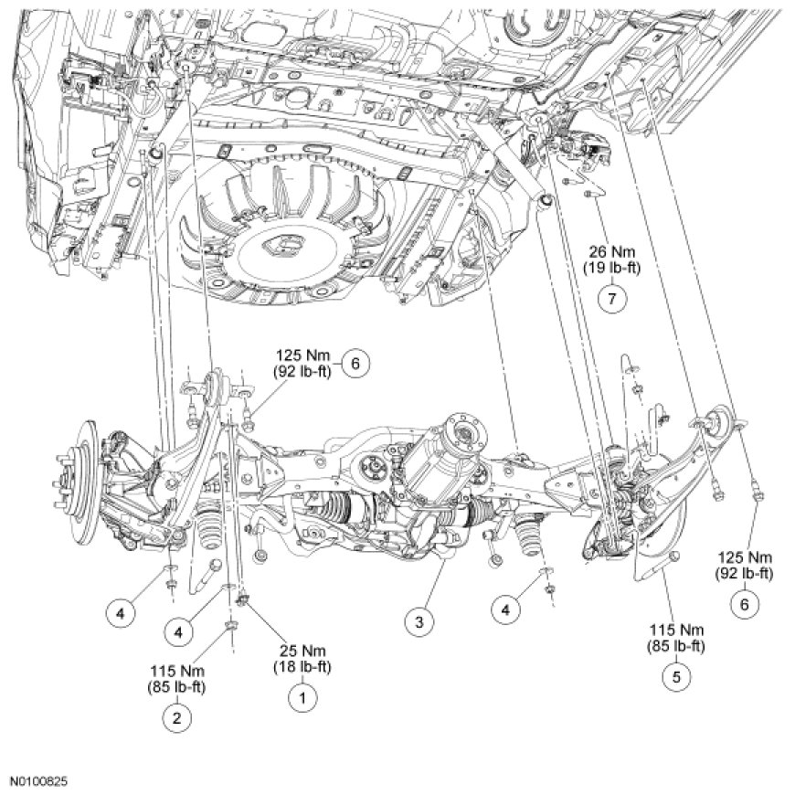 - To install, tighten to 115 Nm (85 lb-ft) with the suspension at the bushing fastener tightening position.