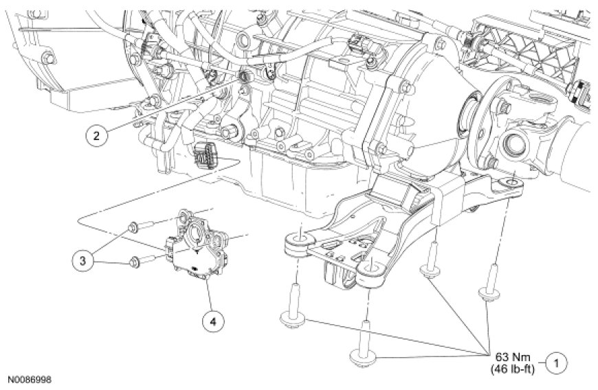 3. Remove the transmission crossmember-to-floor pan screws and lower the transmission enough to gain access to the Transmission Range (TR) sensor.