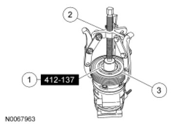5. NOTE: The A/C compressor must be positioned on the press so that only the flat part of the A/C compressor housing is contacting the base with the A/C compressor shaft aligned with the center of the press shaft. If the A/C compressor is not installed correctly on the press, the A/C compressor and/or A/C compressor pulley will be damaged.