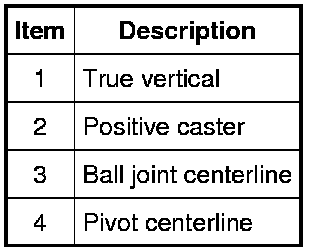Caster is the deviation from vertical of an imaginary line drawn through the ball joints when viewed from the side. The caster specifications will give the vehicle the best directional stability characteristics when loaded and driven. The caster setting is not related to tire wear.