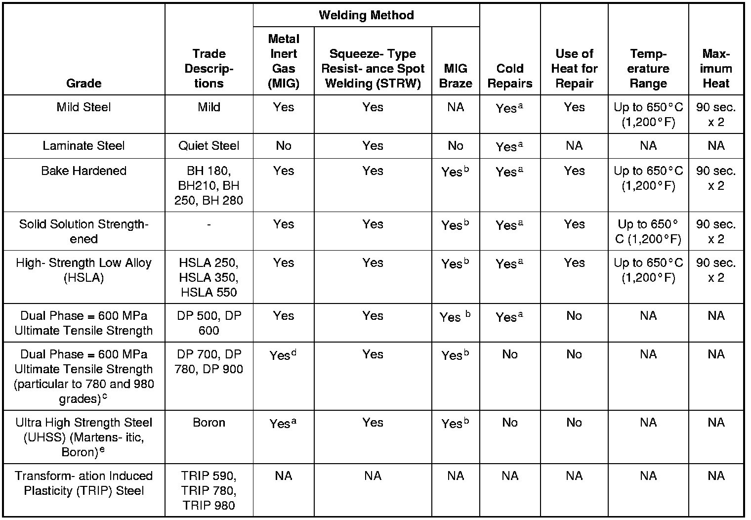 c Dual phase steels DP 700, DP 780 and DP 980 must be replaced at factory joints, no sectioning unless approved procedure in information.