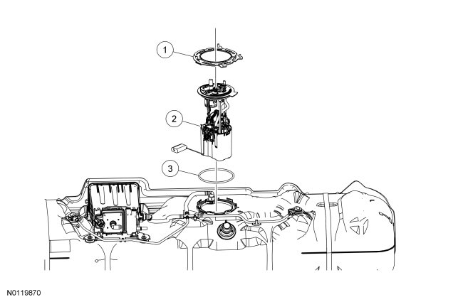 5. NOTE: If the FP does not clear the FP mounting flange on the fuel tank, the use of a screwdriver may be necessary.
