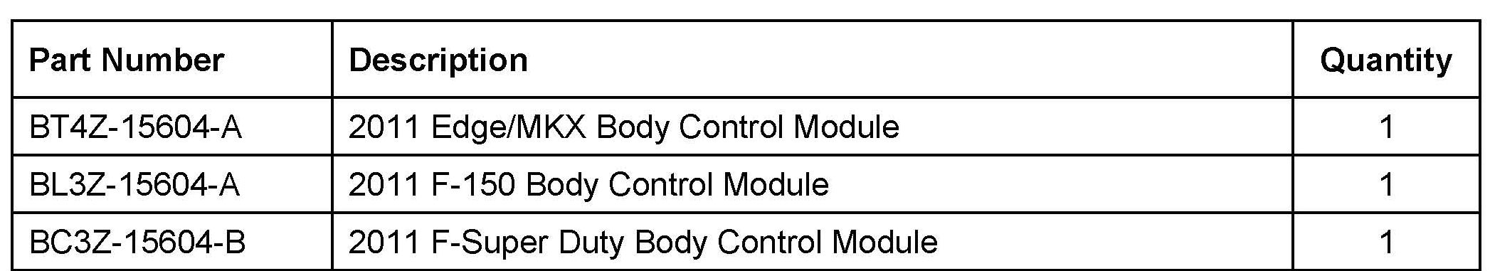 Home >> Ford >> 2011 >> Edge FWD V6-3.7L >> Repair and Diagnosis >> Powertrain Management >> Computers and Control Systems >> Body Control Module >> Technical Service Bulletins >> Recalls >> Recall - Body Control Module Replacement >> Attachment II - Labor and Parts Information