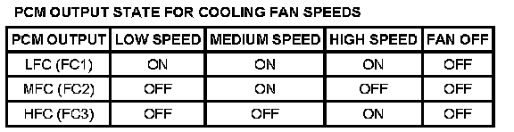 For three-speed fans, although the PCM output circuits are called low, medium, and high fan control (FC), cooling fan speed is controlled by a combination of these outputs. Refer to the following table.