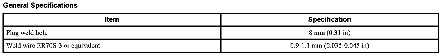 - Factory spot welds may be substituted with either STRW or MIG plug welds. Spot/plug welds should equal factory welds in both location and quantity. Do not place a new spot weld directly over an original weld location. Plug weld hole should equal 8 mm (0.31 in) diameter.