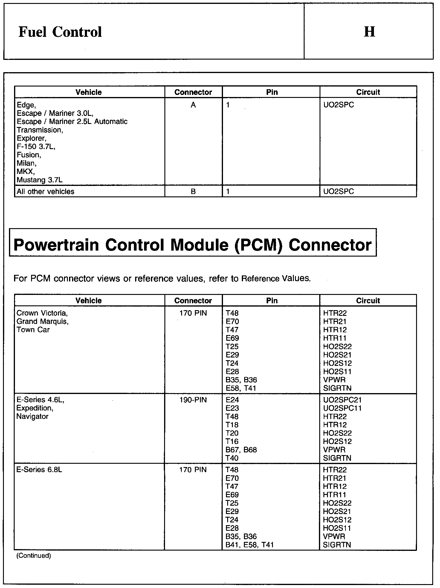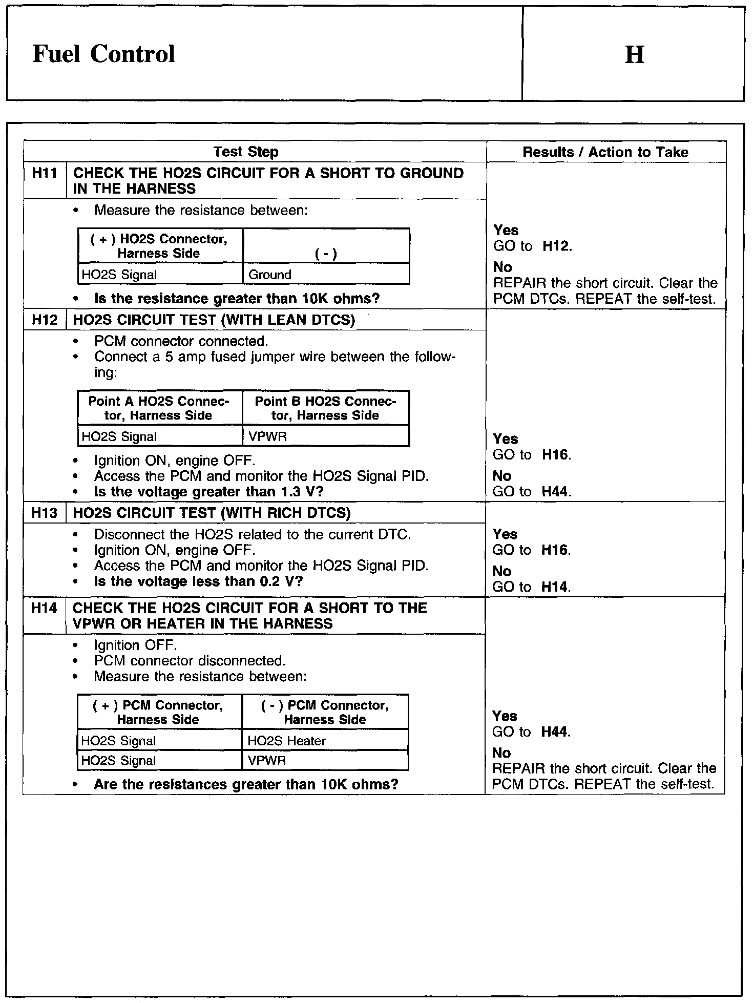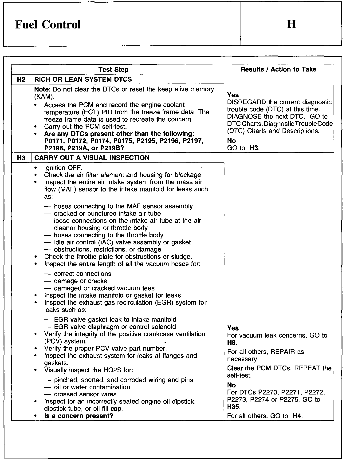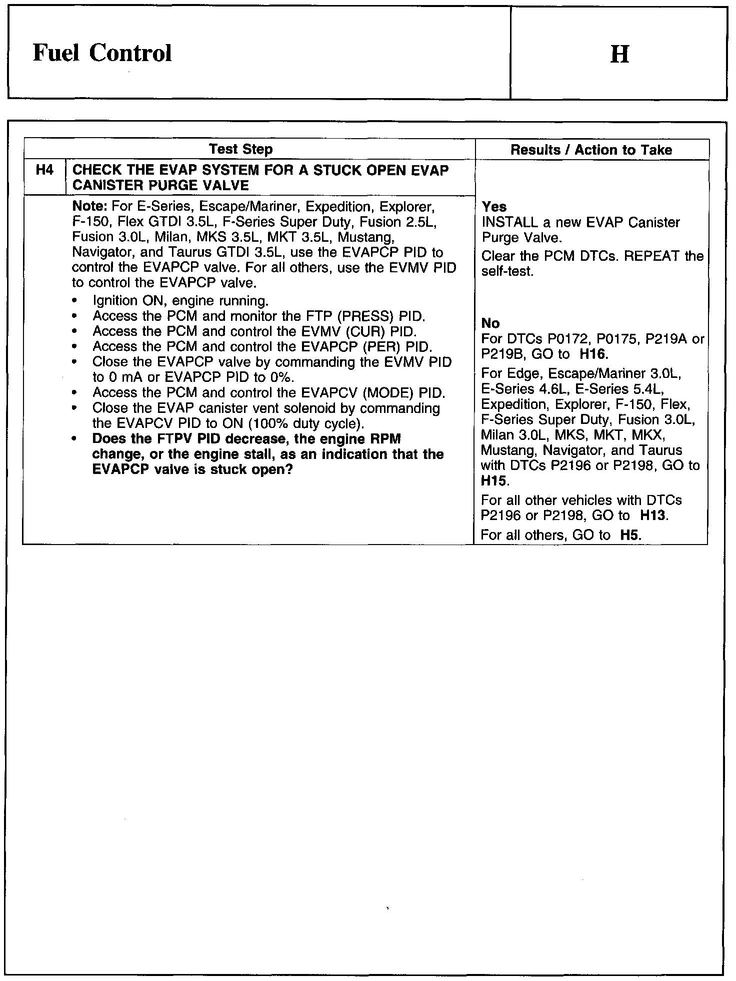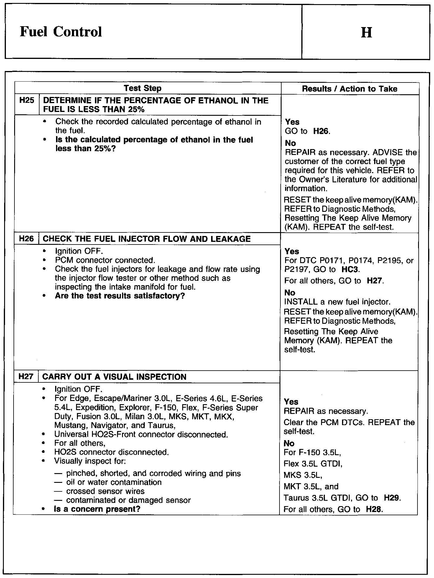 Home >> Ford >> 2011 >> Escape 2WD L4-2.5L >> Repair and Diagnosis >> Powertrain Management >> Computers and Control Systems >> Testing and Inspection >> Pinpoint Tests >> Test H: Fuel Control