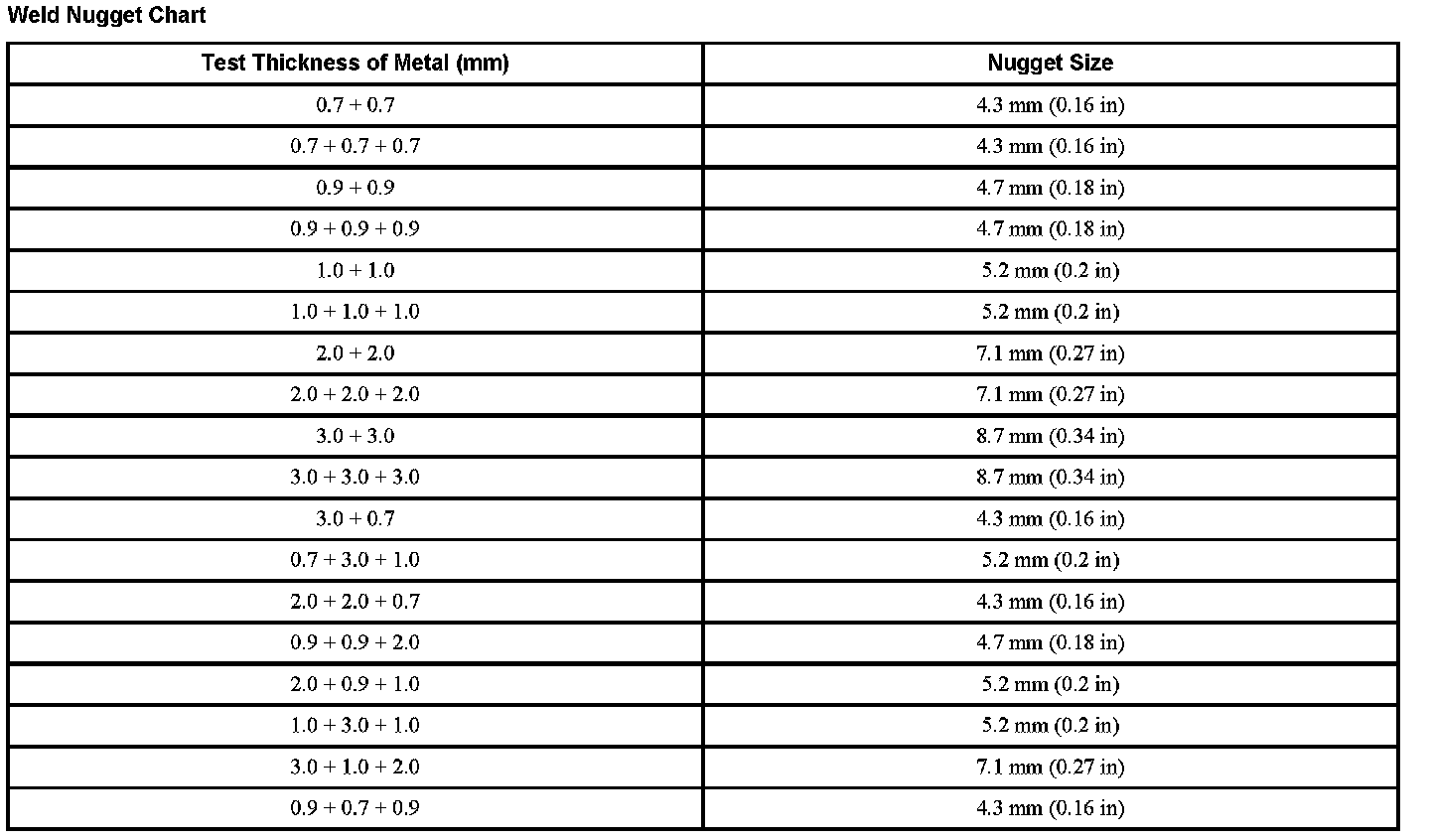 Weld Nugget Chart