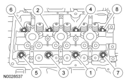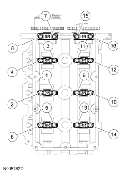 Tighten the RH camshaft bearing cap bolts in the sequence shown in 2 stages.