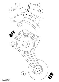 - Visually check the accessory drive belt tensioner for damage and wear, especially the mounting pad surface and arm alignment. If the accessory drive belt tensioner is not installed correctly, the mounting surface pad will be out of position. If the tensioner arm is worn, the arm will be out of alignment. Either of these conditions will result in chirp and squeal noises.