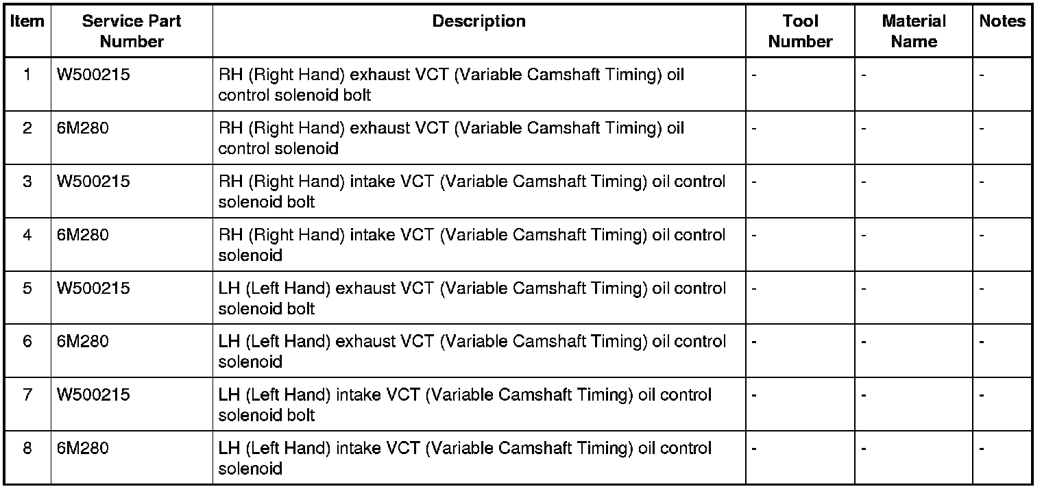 1. NOTE: The VCT (Variable Camshaft Timing) oil control solenoid bolt must be tightened in 2 stages.