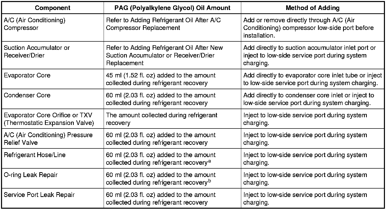 b The amount specified may be used for one or multiple O-ring leak repairs. Do not multiply the PAG (Polyalkylene Glycol) oil amount by the number of O-ring leaks being repaired.
