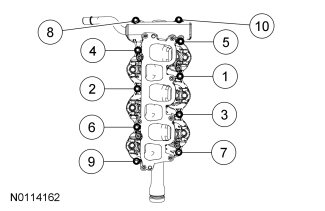Using new lower intake manifold gaskets, install the lower intake manifold and the 10 bolts and tighten in the sequence shown.