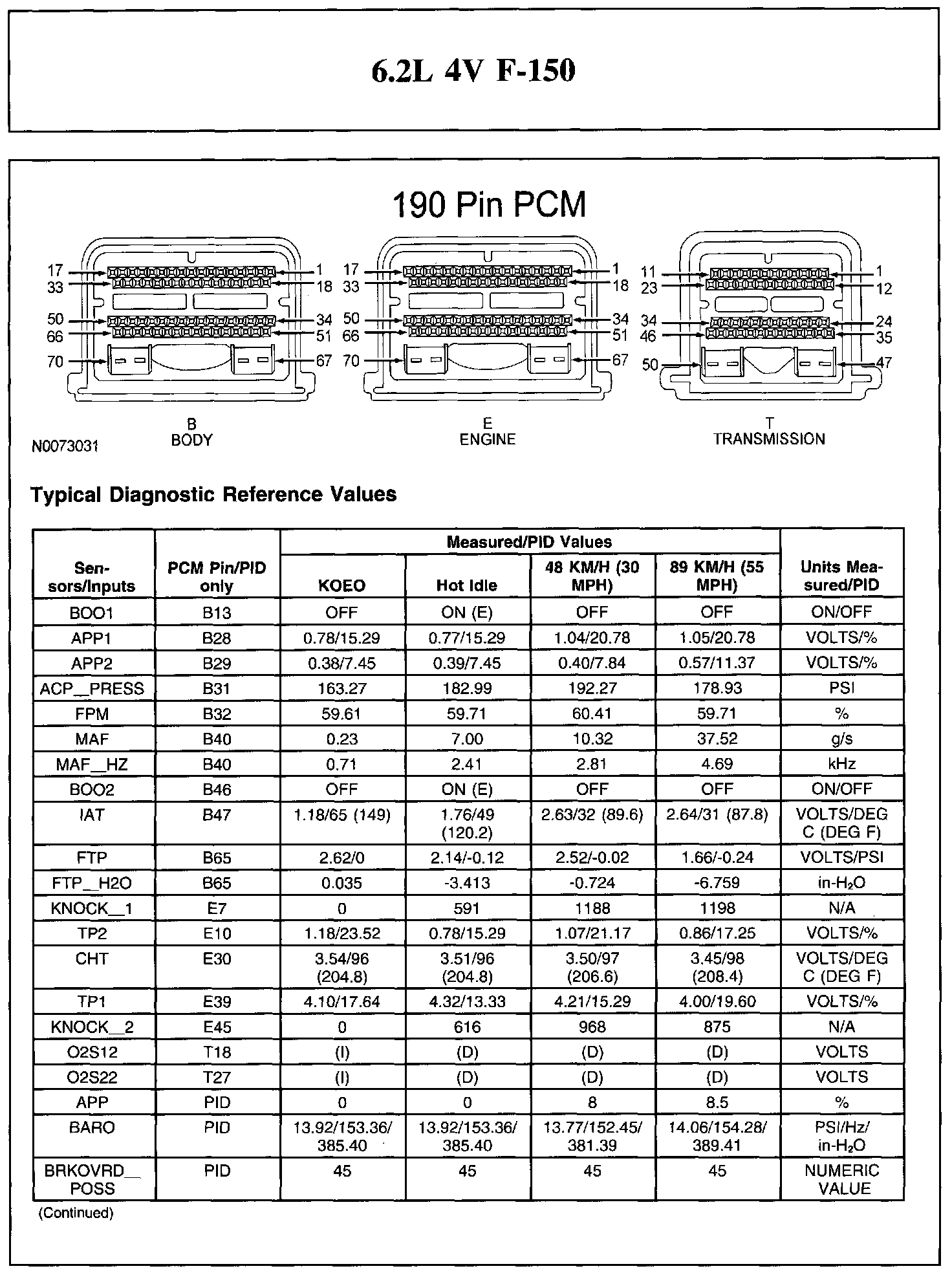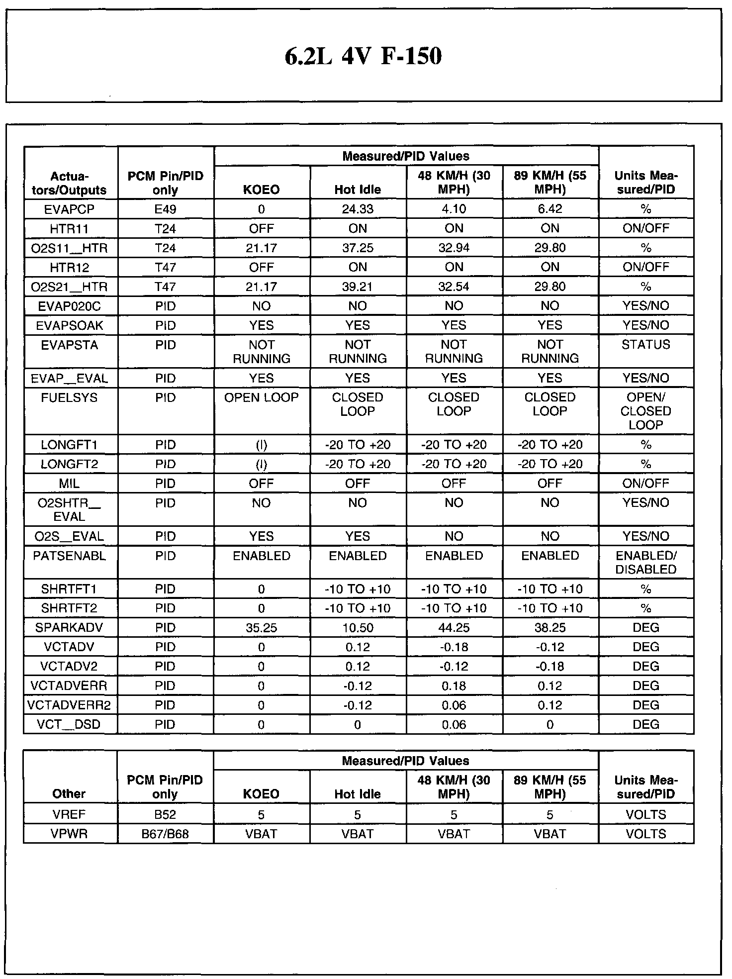 The Typical Diagnostic Reference Value Charts do not display fault parameter identifications (PIDs). These are PIDs which indicate a hard fault with the circuit. They display a value of YES or NO and are PIDs ending with the letter F.